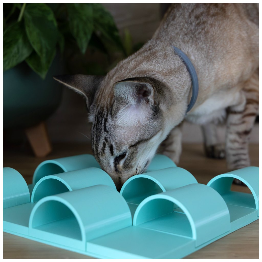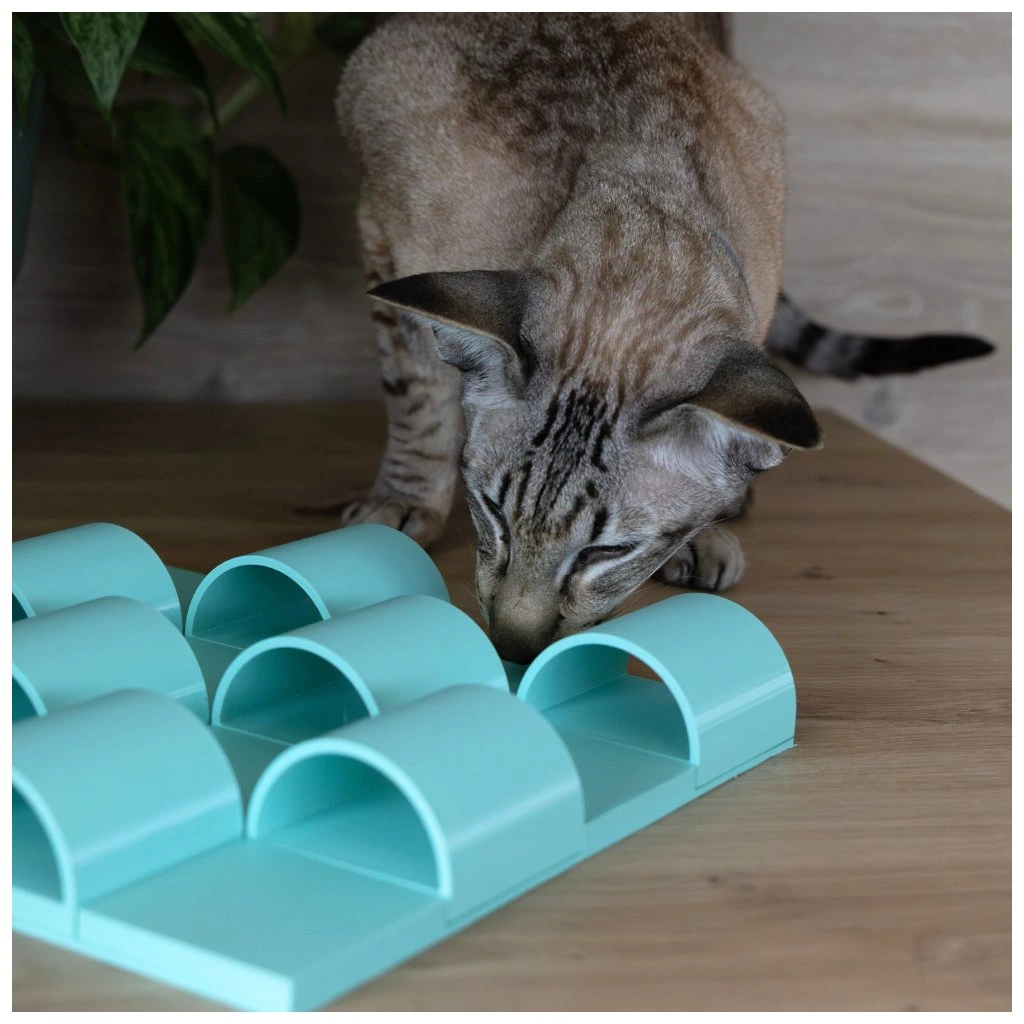 Ne všechno je vidět na první pohled. Tunelář skrývá pamlsky pod obloukovými kryty a motivuje kočku k trpělivému hledání pomocí tlapek a čumáčku. Odměna přichází až po objevení správné cesty.