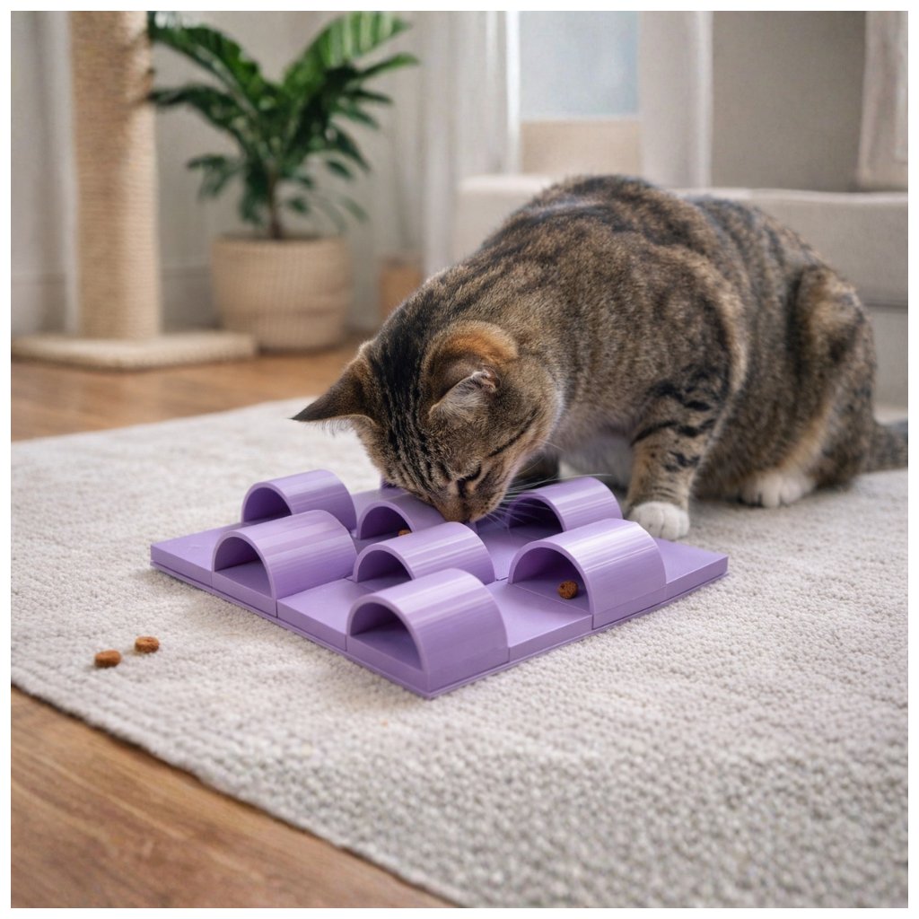 Ne všechno je vidět na první pohled. Tunelář skrývá pamlsky pod obloukovými kryty a motivuje kočku k trpělivému hledání pomocí tlapek a čumáčku. Odměna přichází až po objevení správné cesty.